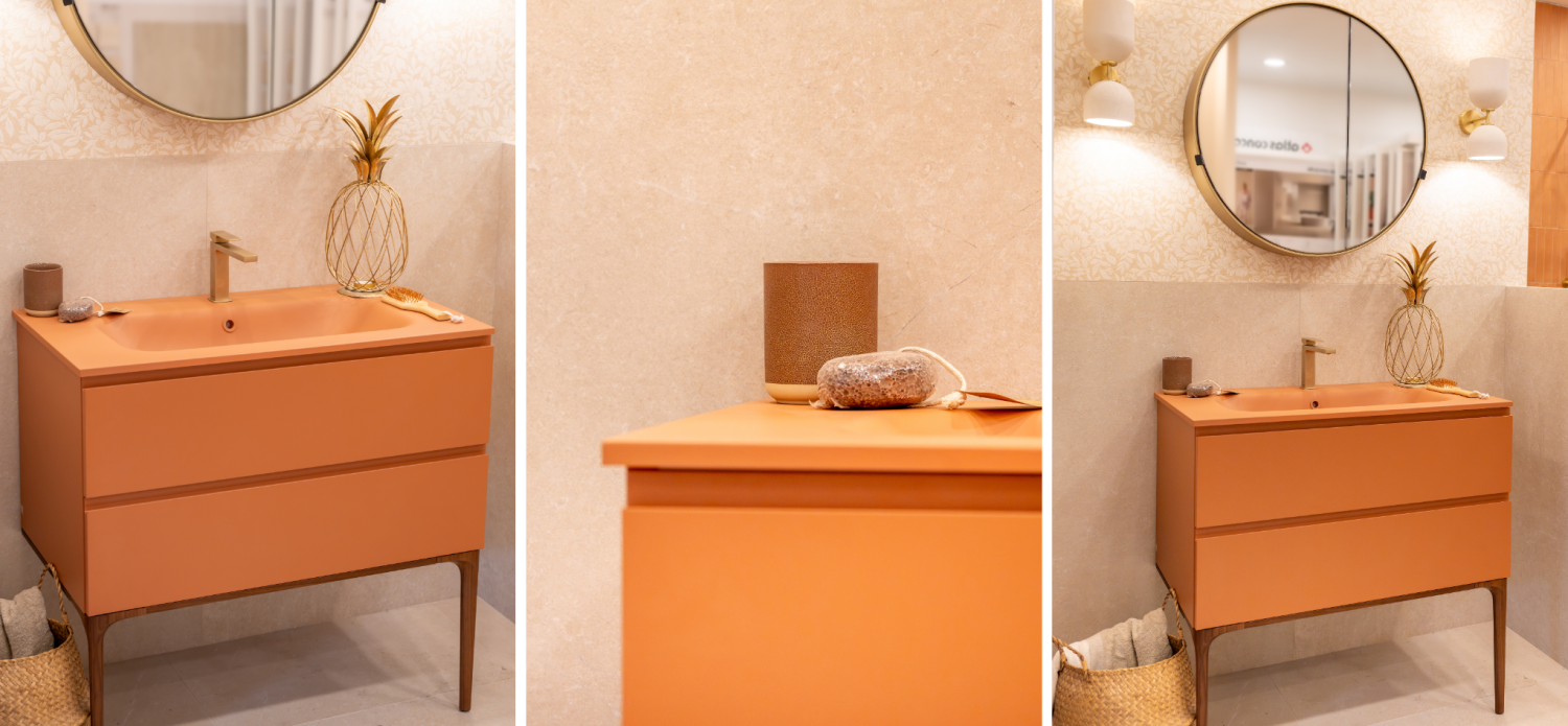 L’orange est l’incontournable couleur tendance 2026, notamment dans ses déclinaisons terracotta ou poudrées. Utilisé sur un meuble de salle de bain comme celui de la Maison Marmorini ou en touches décoratives, il réchauffe immédiatement l’atmosphère.